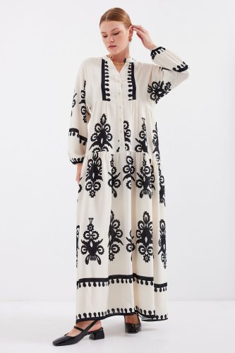 2423 Otantik Desenli Tesettür Elbise M Krem