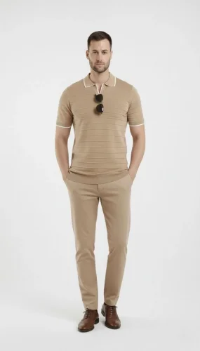 Erkek Fermuarlı Yaka Fitilli Triko Kısa Kollu Regular Fit Tişört Tshirt Bej
